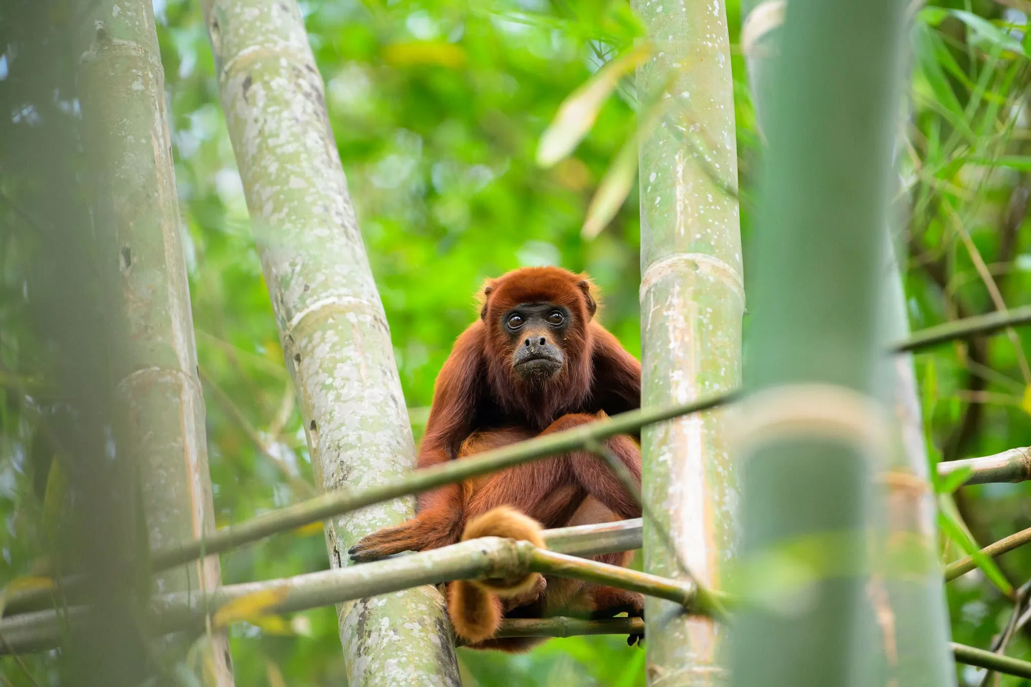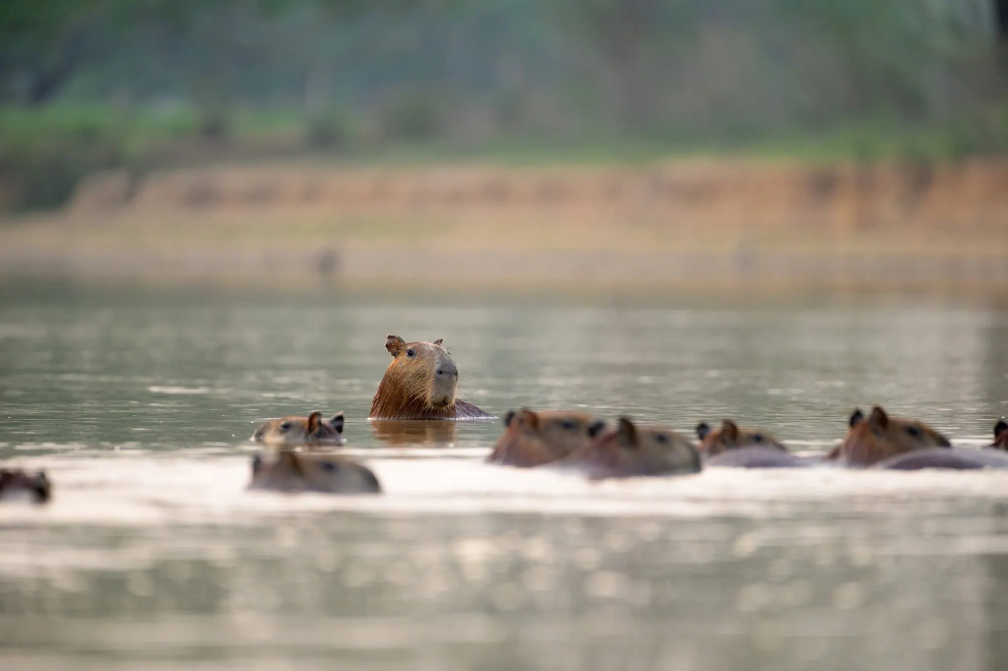 Im Vorfeld hatten wir viel über die Tierwelt dieser Region gehört – und wurden nicht enttäuscht: Keine fünf Minuten nach dem Aufbruch entdeckten wir Dutzende Capybaras (Hydrochoerus hydrochaeris), die im Fluss schwammen, und hunderte kleinere Krokodilkaimane (Caiman crocodilus), die am Ufer dösten. Es war grandios. Dann fanden wir ein schlafendes Stachelschwein im Baum – und endlich auch die Roten Brüllaffen (Alouatta seniculus), unsere dritte Brüllaffenart dieser Reise. Während wir über die weiten Steppen ritten, erzählte uns Yilmer lokale Geschichten. Er sprach nur Spanisch, und wir verstanden vielleicht ein Fünftel – aber es reichte, um einen kleinen Einblick in das Leben und die Geschichte der Llaneros zu bekommen.