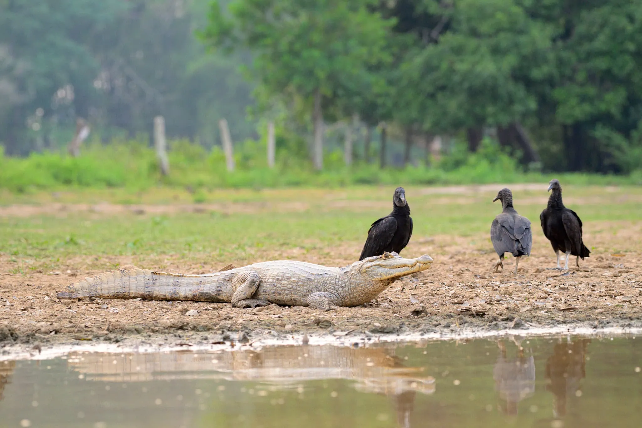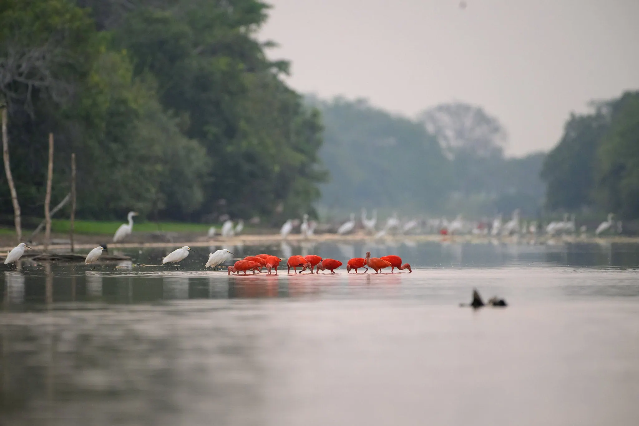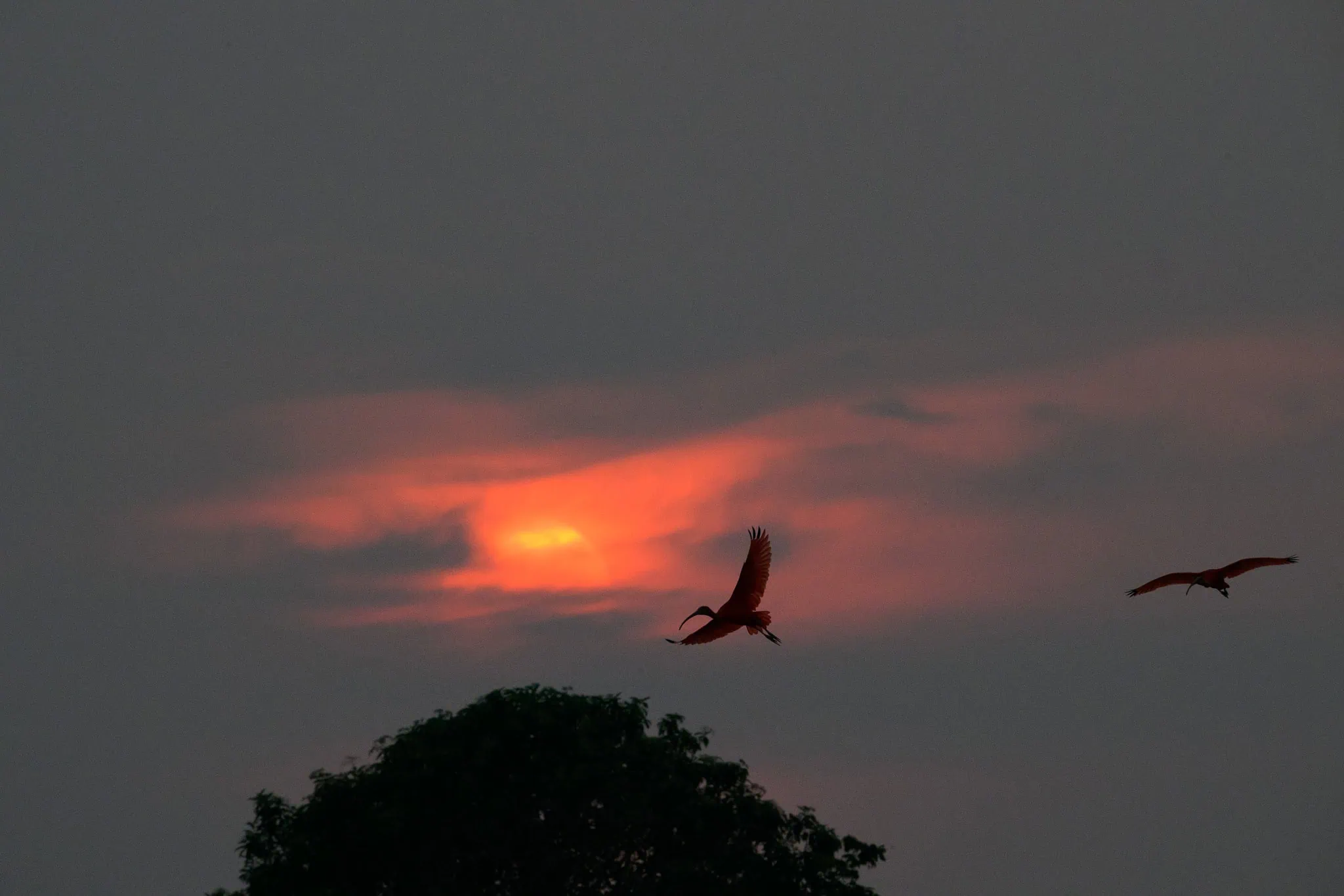 Doch das wahre Highlight unserer Reise durch Kolumbien folgte am Abend: eine Flussfahrt im kleinen Kanu zum Sonnenuntergang. Unzählige Kaimane begleiteten uns durchs Wasser, während vor uns Rosalöffler (Platalea ajaja) und Schwarzmantel-Scherenschnäbel (Rynchops niger cinerascens) nach Nahrung suchten. Die Biodiversität war – unserer Meinung nach – fast so überwältigend wie auf den Galápagos-Inseln. Wir kamen aus dem Staunen, Schauen und Fotografieren nicht mehr heraus. Ohne zu reden, mit einem kühlen Bier in der Hand, saßen wir gemeinsam mit Yilmer im Kanu und genossen den Sonnenuntergang.