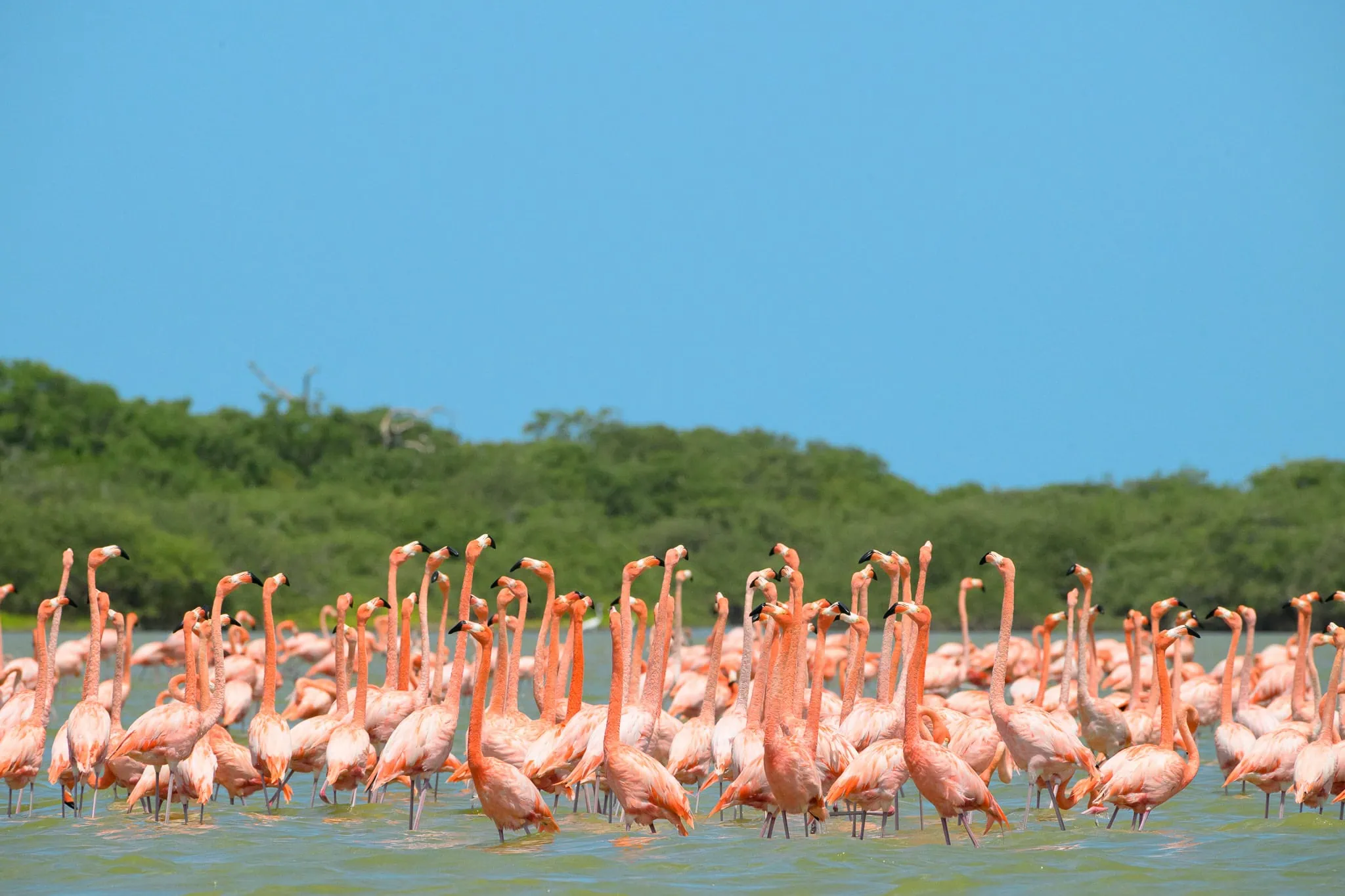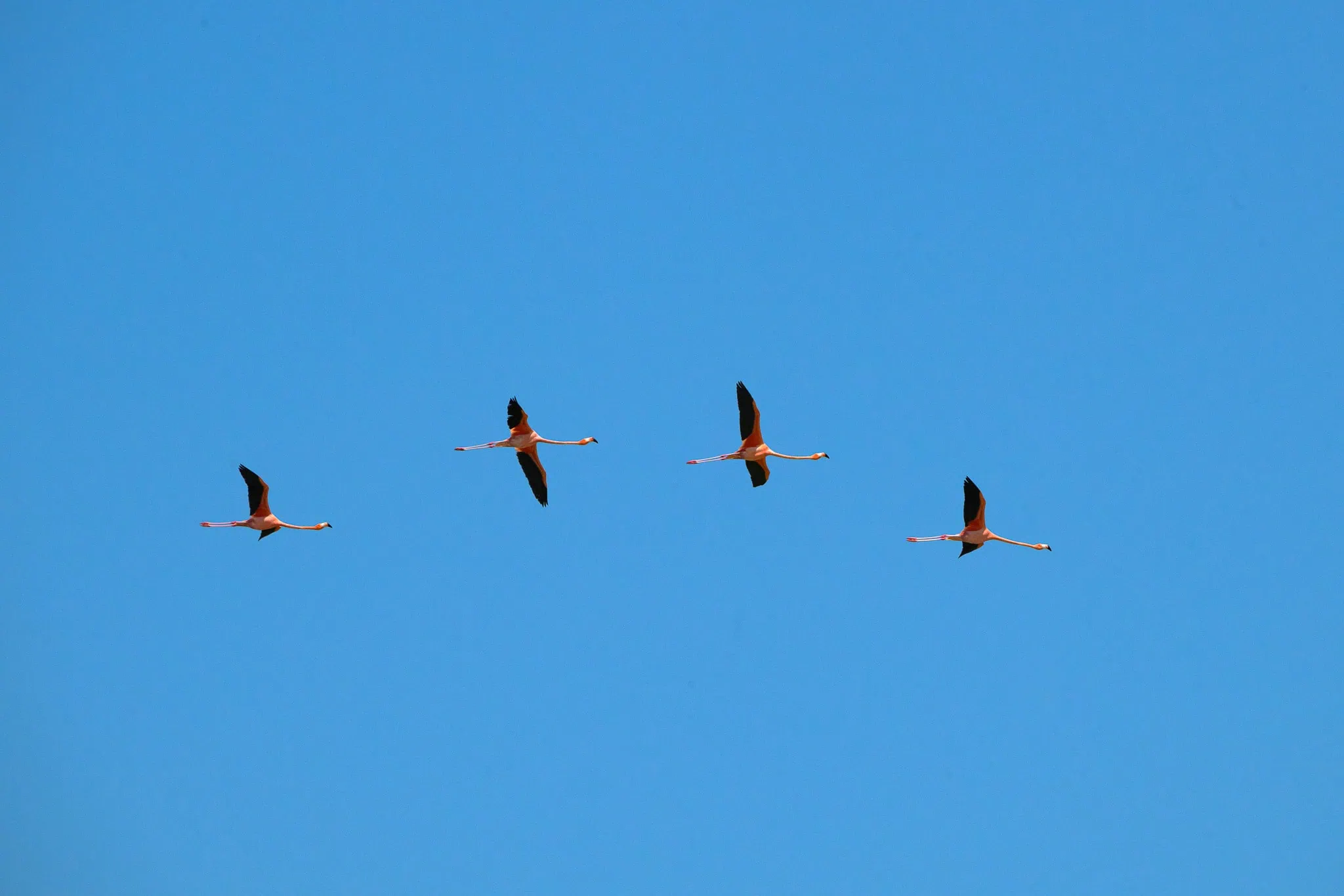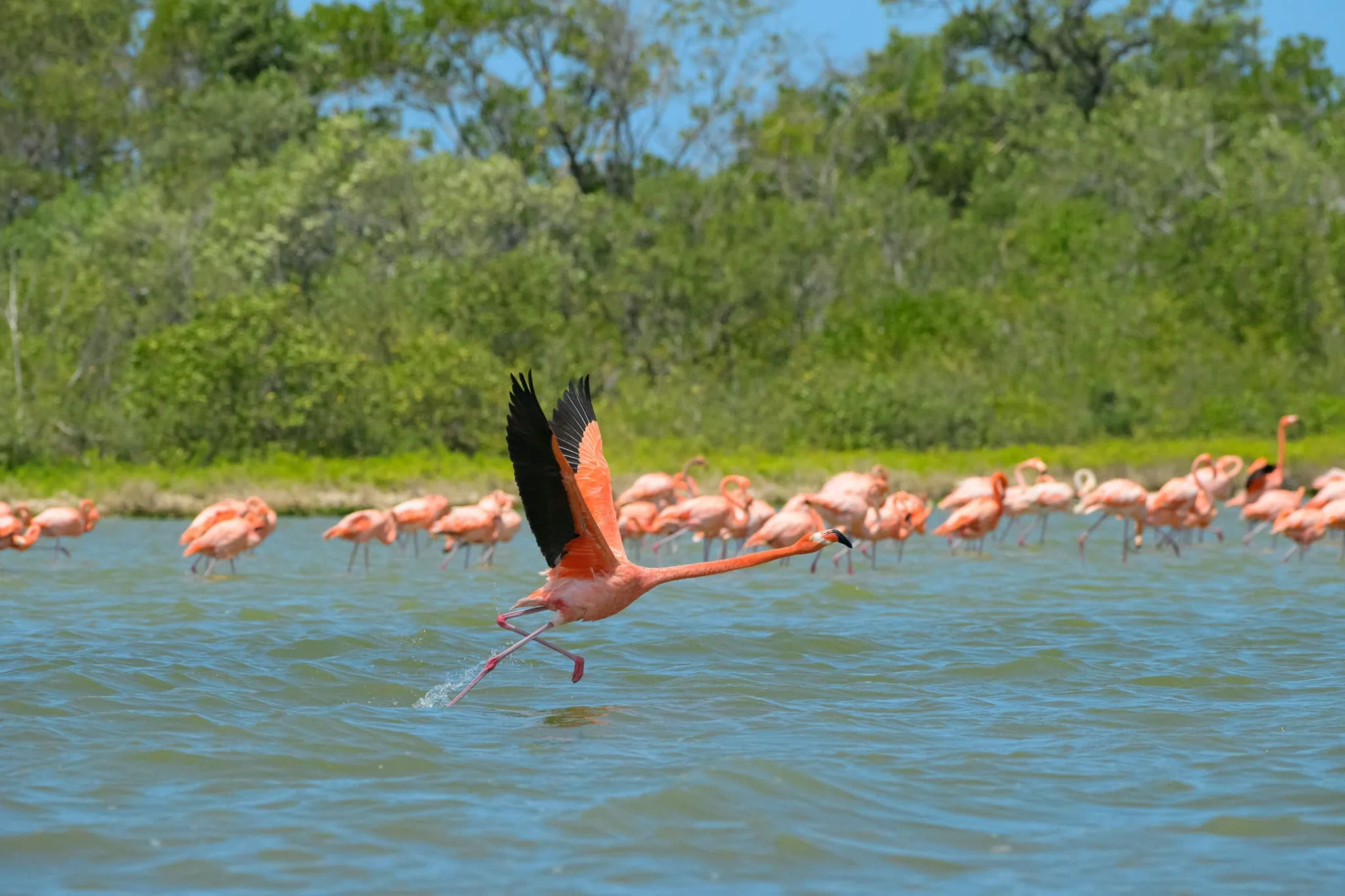 Nach einigen Tagen am Pool, am Strand und irgendwo dazwischen zog es uns nach Camarones zu den Lagunen, in denen Flamingos leben. Nach einer anderthalbstündigen Busfahrt wurden wir einzeln auf Motorräder gesetzt – und dann ging es eine Stunde lang in der prallen Mittagssonne über kleine Inseln in den Lagunen. Irgendwann erreichten wir einen Bootsanleger, wo bereits ein kleines, wackeliges Segelboot auf uns wartete. Nach kurzer Zeit sahen wir sie endlich: 2000 Kuba-Flamingos (Phoenicopterus ruber). Da wir uns sehr leise verhielten, konnten wir erstaunlich nah an die Tiere herankommen. Einige flogen auf, doch die meisten blieben nur neugierig stehen und beobachteten uns.